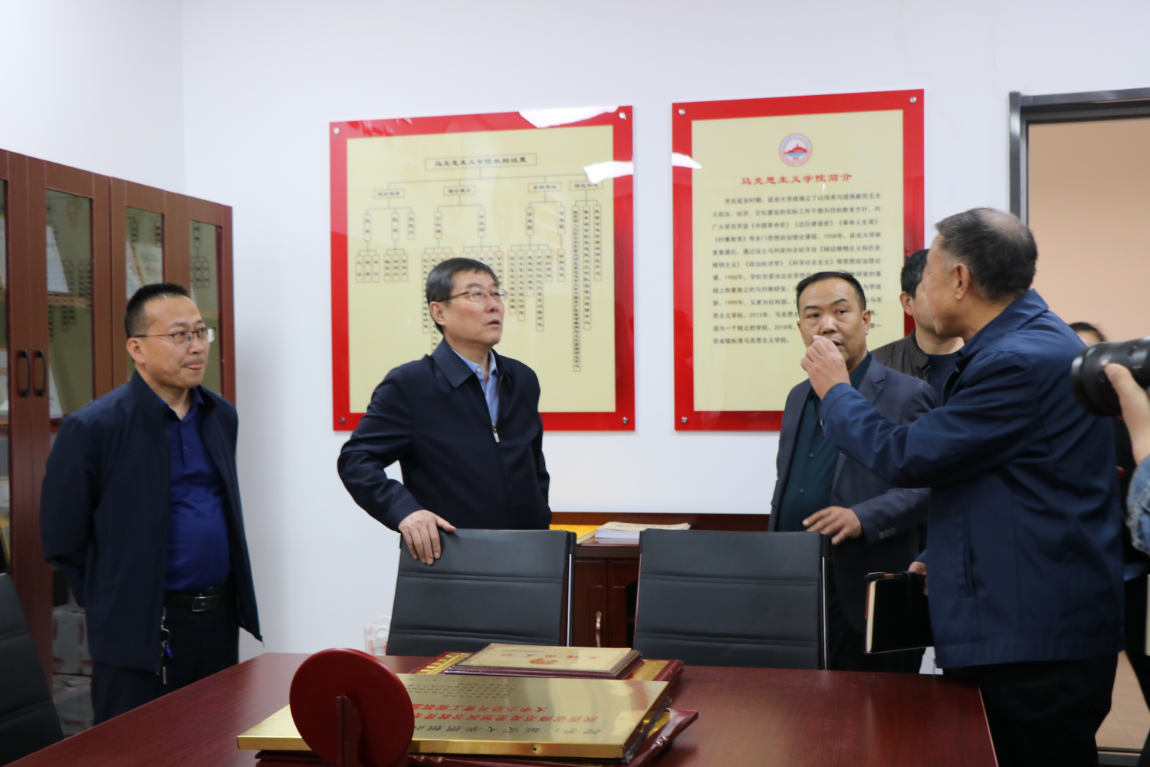 陈书记首先实地检查听取了学院资料室、5G实验室、党员活动室的建设情况,在“省级重点马克思主义学院建设成果展示室”就重点马院考察的框架指标及支撑材料等进行逐项检查指导,在参观学院楼宇文化建设方面,就“中共中央在延安十三年”为主题的红色党史文化墙方面提出了很有建设性的指导意见。随即在学院会议室召开了现场办公会,结合工作实际对学院下一阶段的筹备准备工作进行了指导,陈书记指出:一是要进一步将学校、学院的育人理念融入、丰富到“楼宇文化”之中;二是要持续推进学院红色数据库和5G实验室的建设;三是要进一步夯实责任分工,稳步推进省级重点马院建设工作。