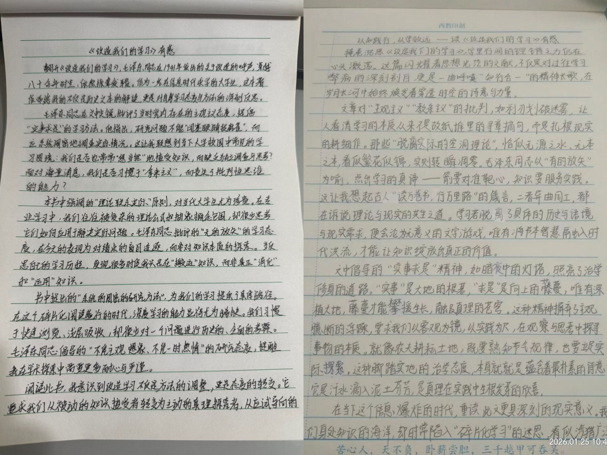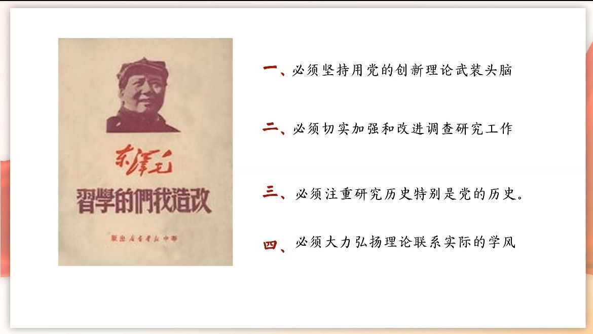 课程现场:课程以写作背景—主要内容—现实意义三层框架解读《改造我们的学习》:梳理抗战时期党内思想问题,阐明写作背景与使命;精读原文,批判不良学风,阐释实事求是、理论联系实际的核心思想,区分主观主义与马克思主义学风;结合新时代干部教育、基层治理与调查研究,引导青年党员学以致用、践行信仰。