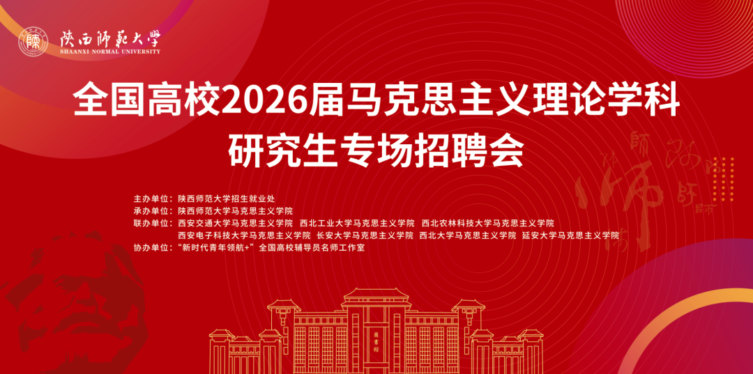 为深入贯彻落实党中央、国务院关于“稳就业”“促就业”的决策部署,搭建用人单位和毕业生双向选择平台,全力以赴促进2026届毕业生高质量就业,由陕西师范大学招生就业处主办,马克思主义学院承办,西安交通大学、西北工业大学、西北农林科技大学、西安电子科技大学、长安大学、西北大学、延安大学等高校马克思主义学院共同联办,“新时代青年领航+”全国高校辅导员名师工作室协办的“全国高校2026届马克思主义理论学科研究生专场招聘会(陕西师范大学)”计划于2026年3月21日在陕西师范大学长安校区举办。