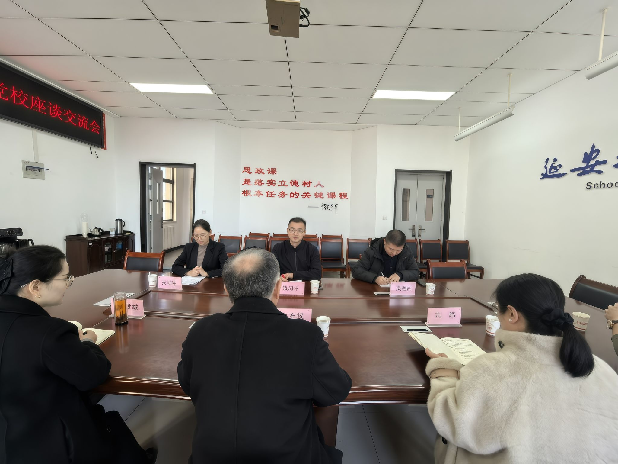 2025年12月10日上午,石嘴山市市委组织部副部长、市委党校副校长钱周伟一行来到延安大学马克思主义学院,在学院312会议室开展校地合作座谈交流。延安大学马克思主义学院院长高布权教授主持会议,学院副院长臧爱绒、亢鸽共同参会,双方围绕资源共享、人才共建、合作共赢展开深入交流。首先,高布权院长代表学院对钱周伟副部长一行的到来表示欢迎,并简要介绍了延安大学的办学历史、红色文化底蕴,以及马克思主义学院在学科建设、师资队伍、人才培养、科研成果等方面的基本情况。