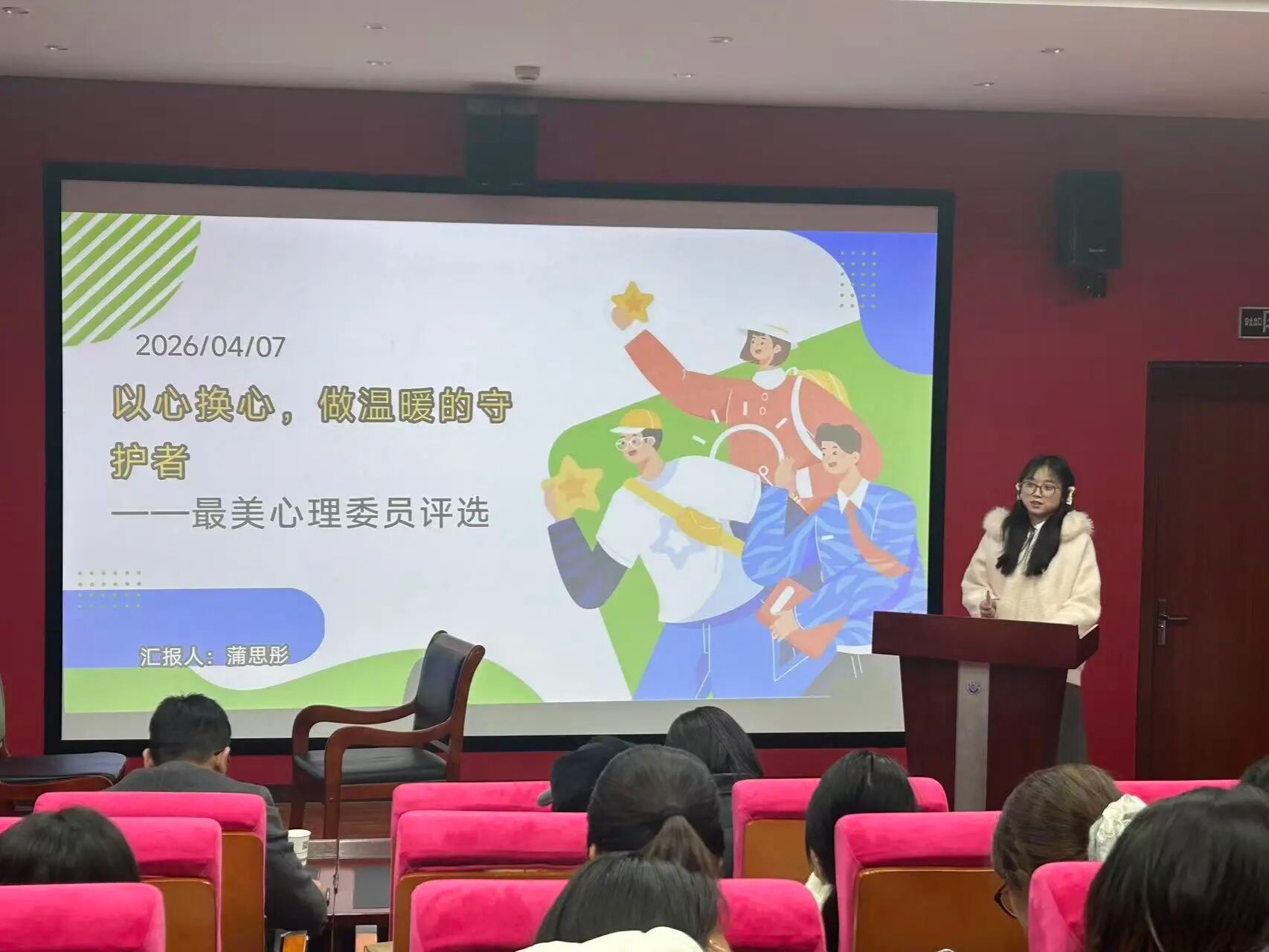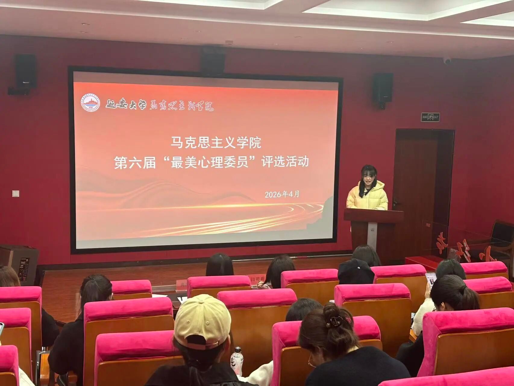 为充分发挥心理委员在班级心理健康工作中的重要作用,强化学院心理育人实效,营造温馨的育人环境。4月8日下午,马克思主义学院第六届“最美心理委员”评选活动在学院一楼报告厅举行。学工部心理健康教育中心高雨薇老师、院党委副书记赵海龙老师、团委书记闫莉莉老师、党委组织员苗玉园老师担任评委,全体心理委员及参演学生参加。本次评选由杨浩琪同学主持。