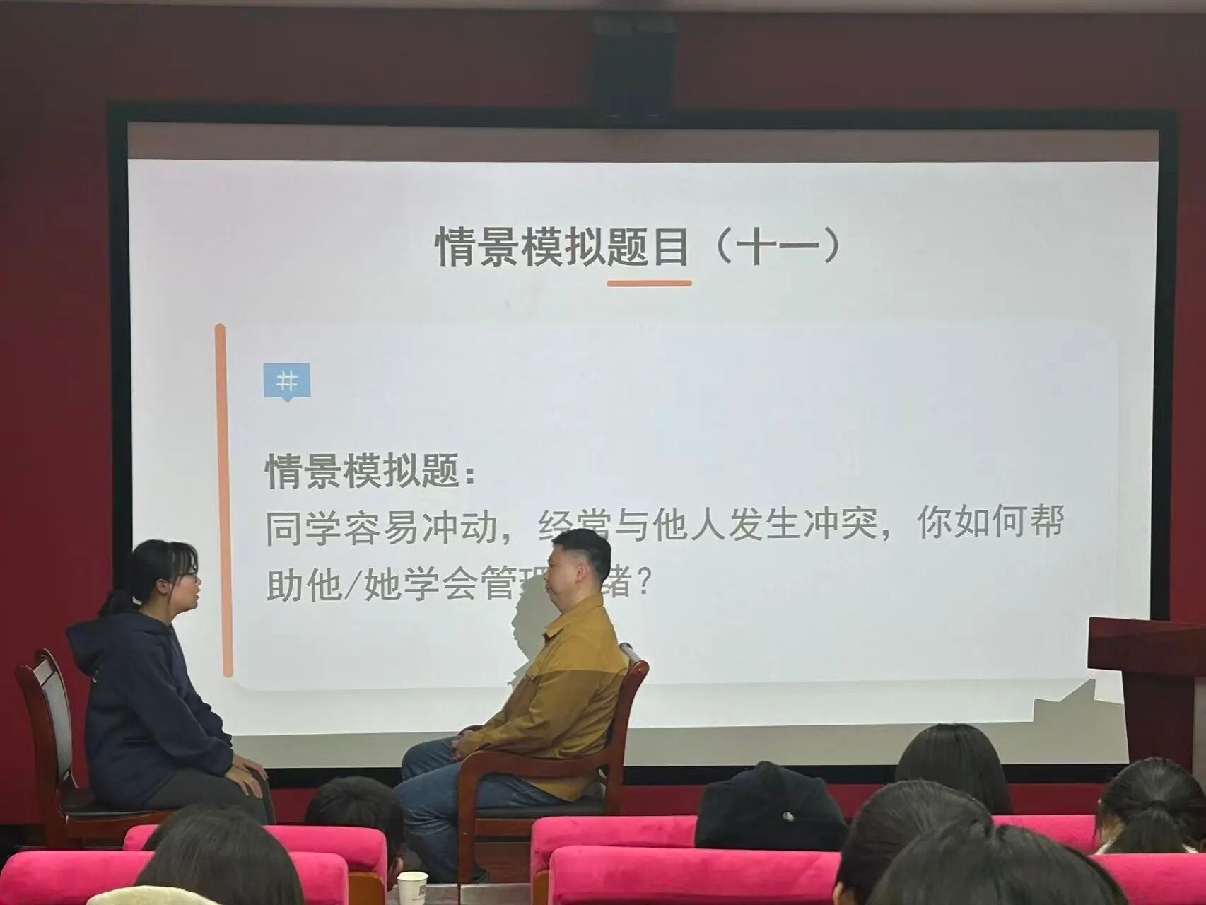 活动分为自我展示和情景模拟两个环节。在自我展示环节,各位参评选手立足岗位、认真履职,以饱满的精神状态全面展示工作实绩、个人风采与履职心得,充分展现出心理委员的责任意识与服务热情。在情景模拟环节,选手们现场抽题、从容应对,运用专业知识与沟通技巧处理各类心理场景问题,展现了扎实的应急处置能力、良好的沟通素养与灵活的应对水平,生动诠释了心理委员作为班级心理健康“第一道防线”的担当与素养。