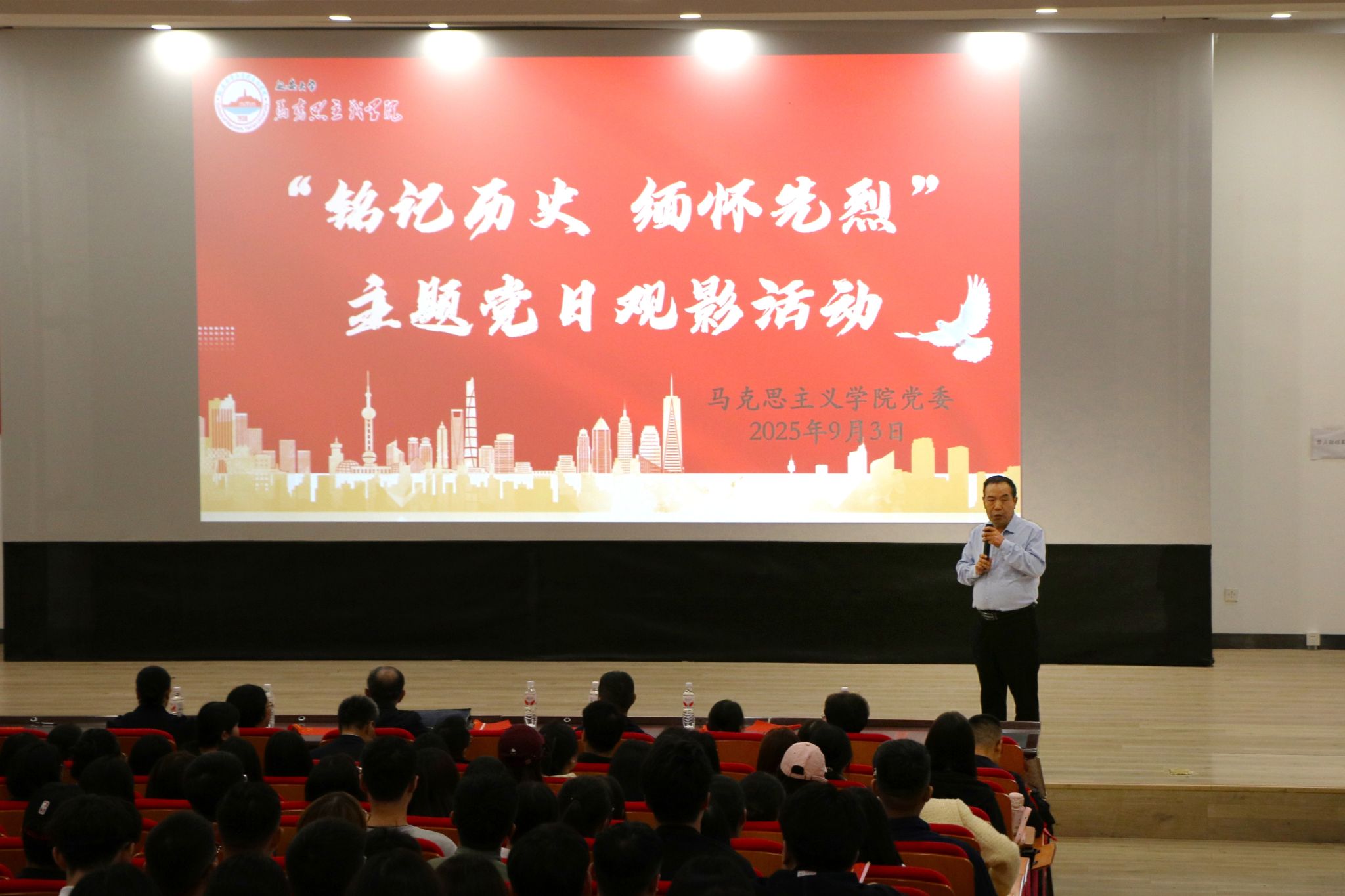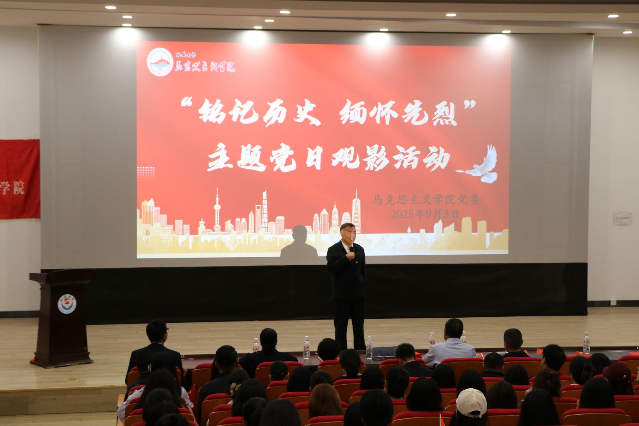为进一步深化爱国主义教育,传承伟大抗战精神,9月3日上午,马克思主义学院党委组织全体师生在大学生活动中心红色影院开展了“铭记历史 缅怀先烈 珍爱和平 开创未来”主题党日观影活动。活动由党委书记张彬主持。