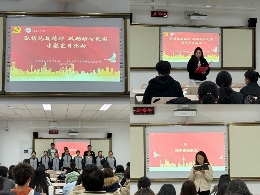 为纪念中国人民抗日战争暨世界反法西斯战争胜利80周年,弘扬伟大抗战精神,凝聚奋进磅礴力量,马克思主义学院党委于10月22日下午在五教5101教室开展“弘扬抗战精神,砥砺初心使命”主题党日活动。马克思主义学院教工、研究生、本科生党支部全体党员参加了此次活动。活动由研究生党支部委员曹心蓉主持。