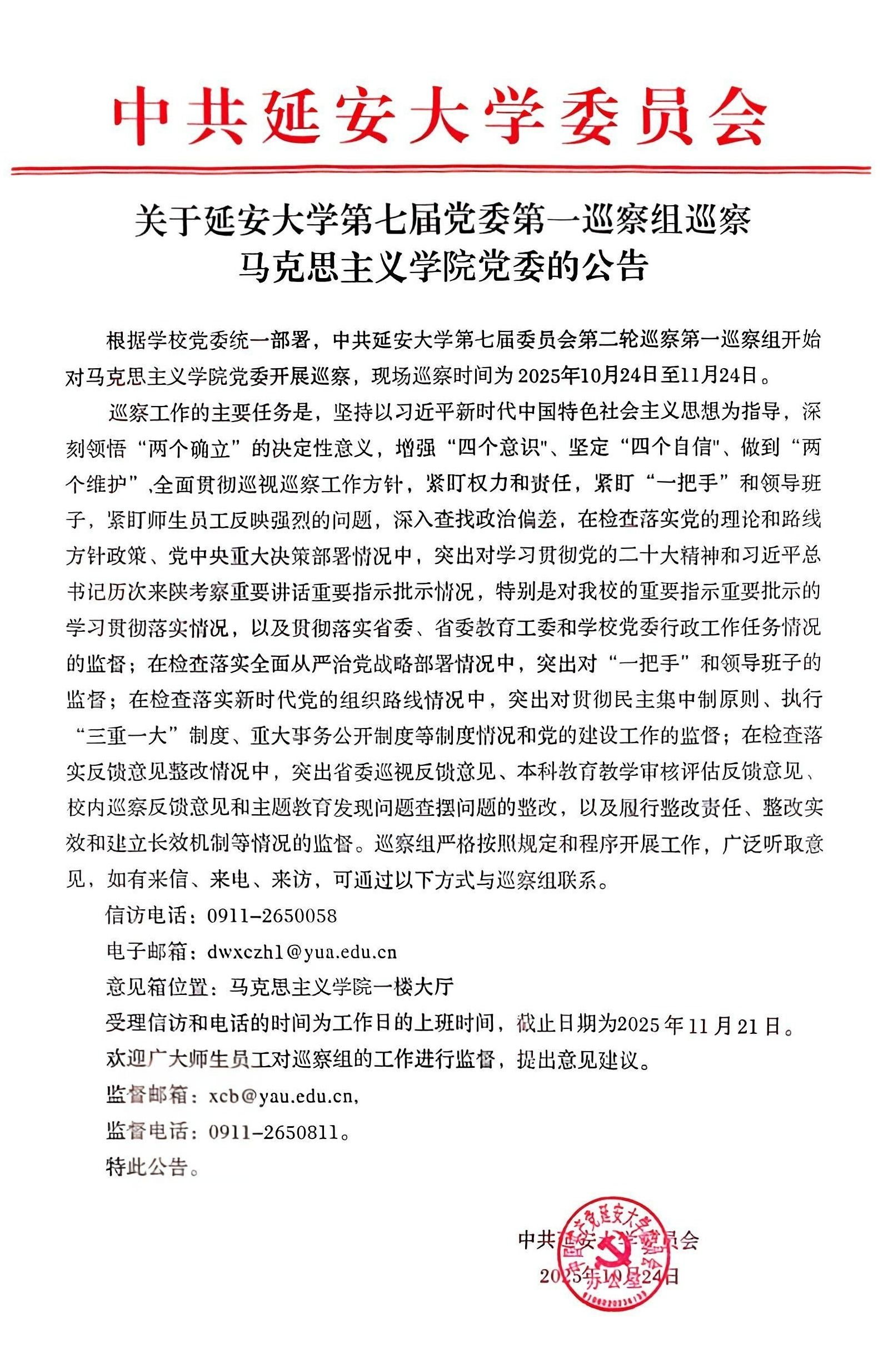 关于延安大学第七届党委第一巡察组巡察马克思主义学院党委的公告