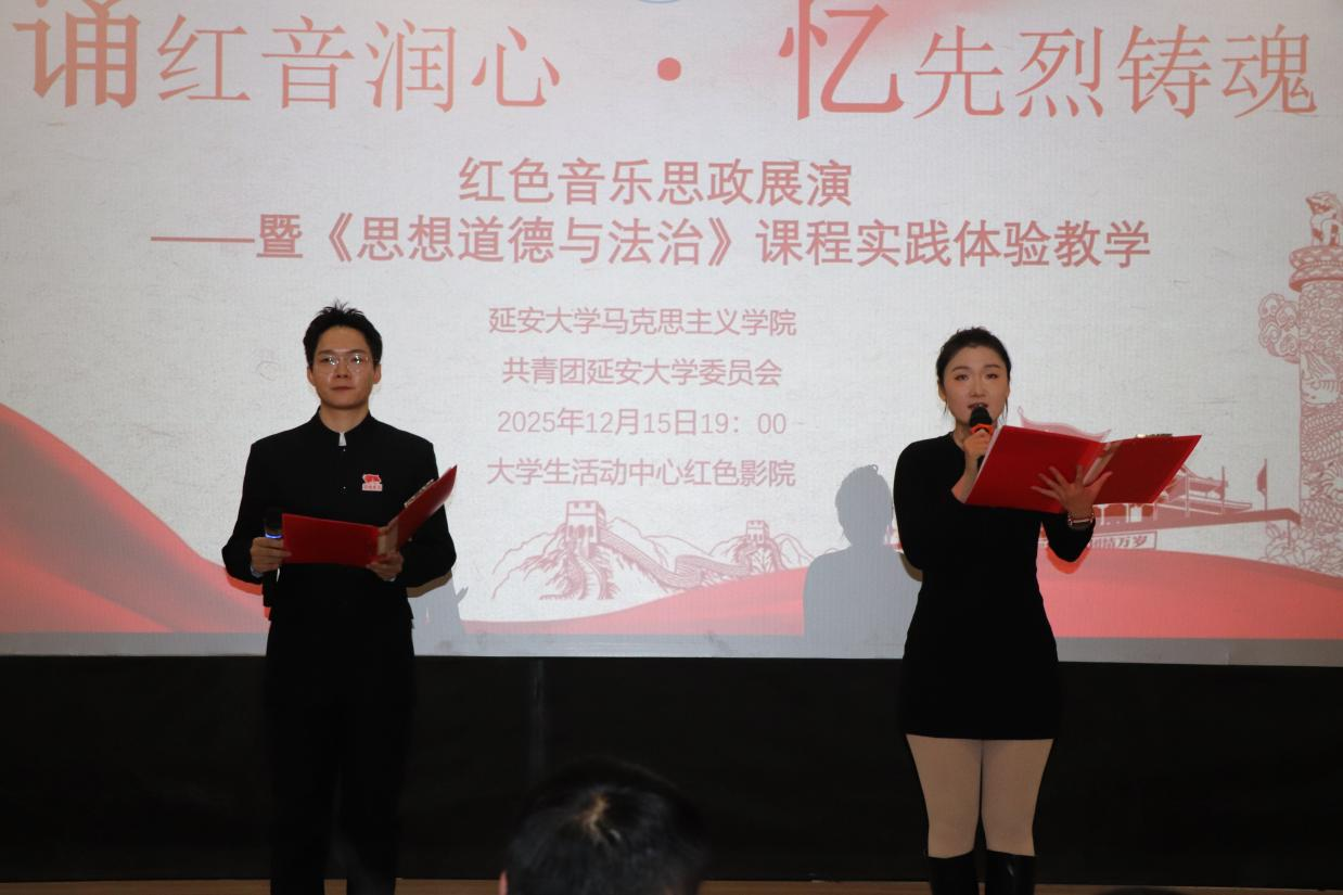 12月15日19时,延安大学大学生活动中心红色影院内。以“诵红音润心·忆先烈铸魂”为主题的红色音乐思政展演暨《思想道德与法治》课程实践教学活动精彩启幕。本次活动由延安大学马克思主义学院、共青团延安大学委员会联合主办,以红色音乐为载体,将思政课程与艺术实践深度融合,让师生在经典旋律中缅怀先烈、筑牢信仰。