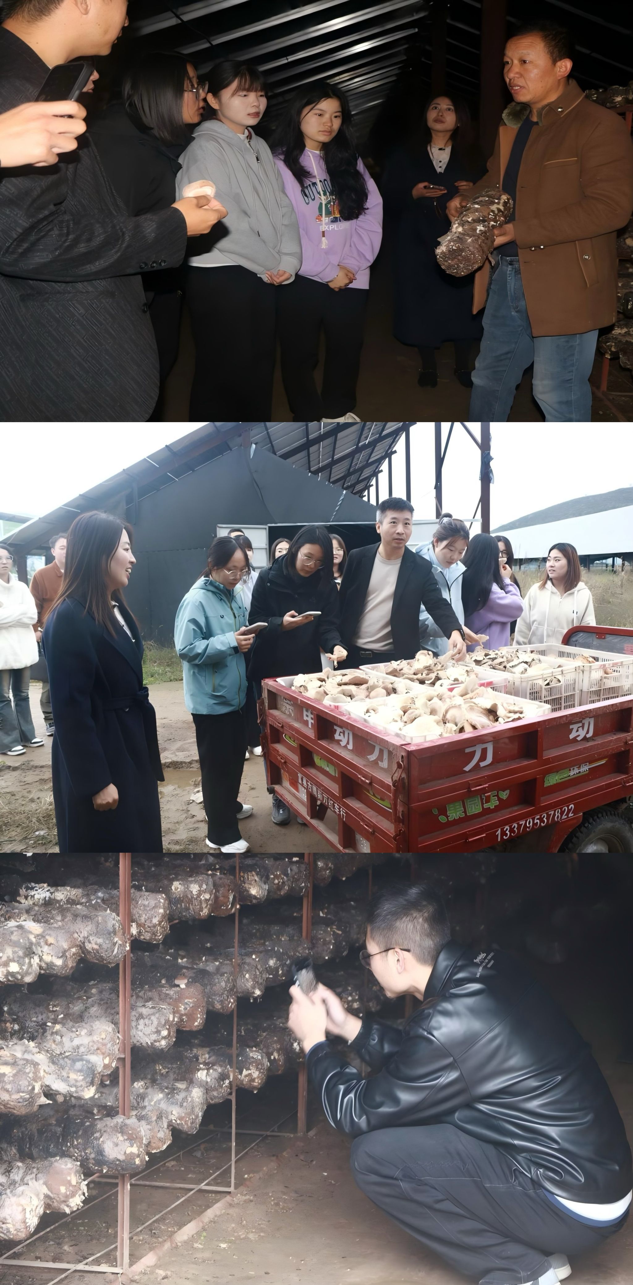 下午,团队前往五里桥田园综合体与象鼻子湾香菇种植基地。团队成员沿着观光路线实地考察,沉浸式感受 “农业+旅游” 融合发展的新业态,细致探寻特色农业项目在激活乡村资源、带动农户增收、推动乡村振兴中的实践脉络。同时,师生们与香菇基地负责人刘先生展开了深入交流,他系统介绍了基地的发展历程与运营模式,展现了特色农业项目在带动农户增收、促进乡村振兴方面的具体情况。