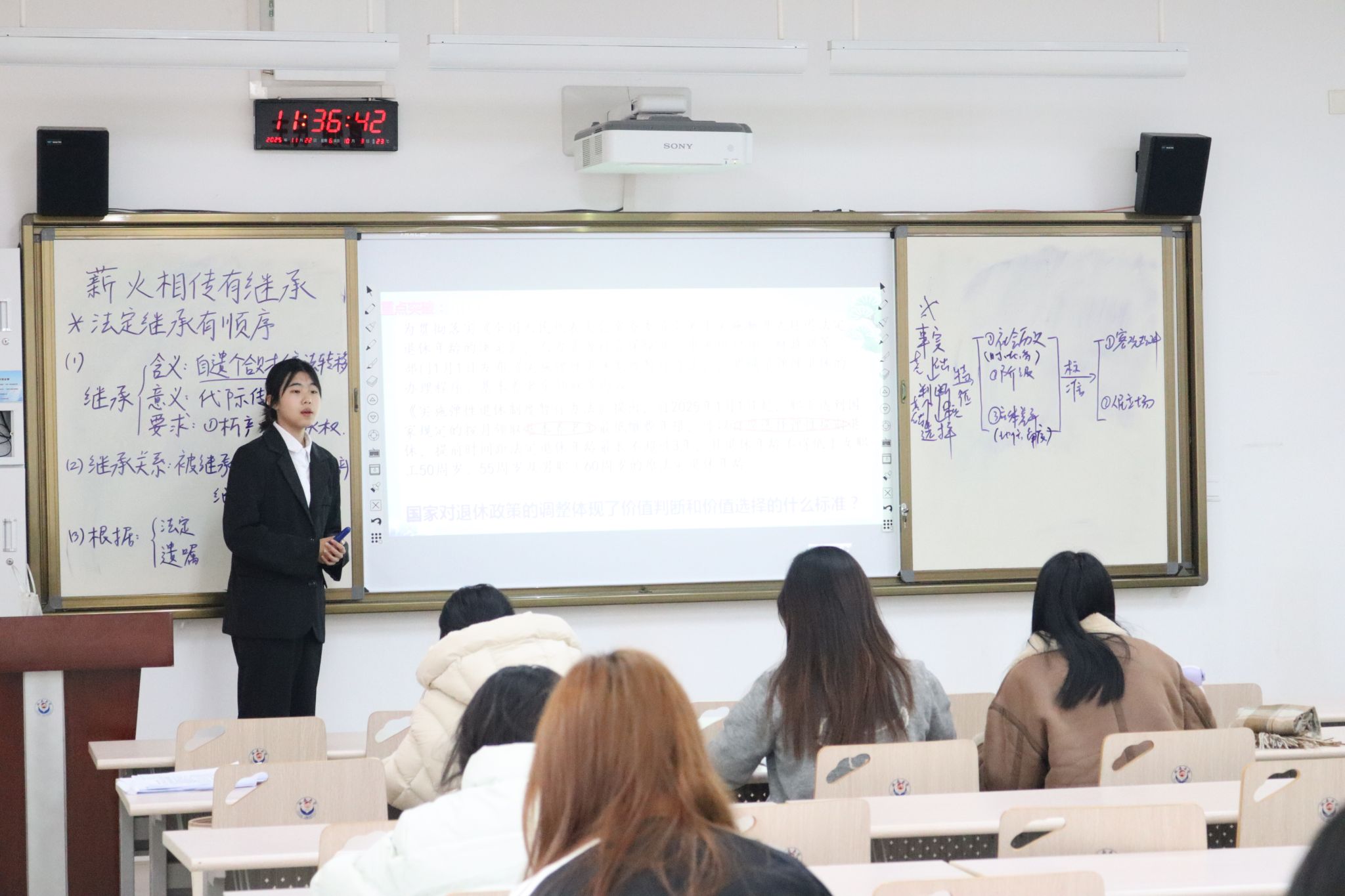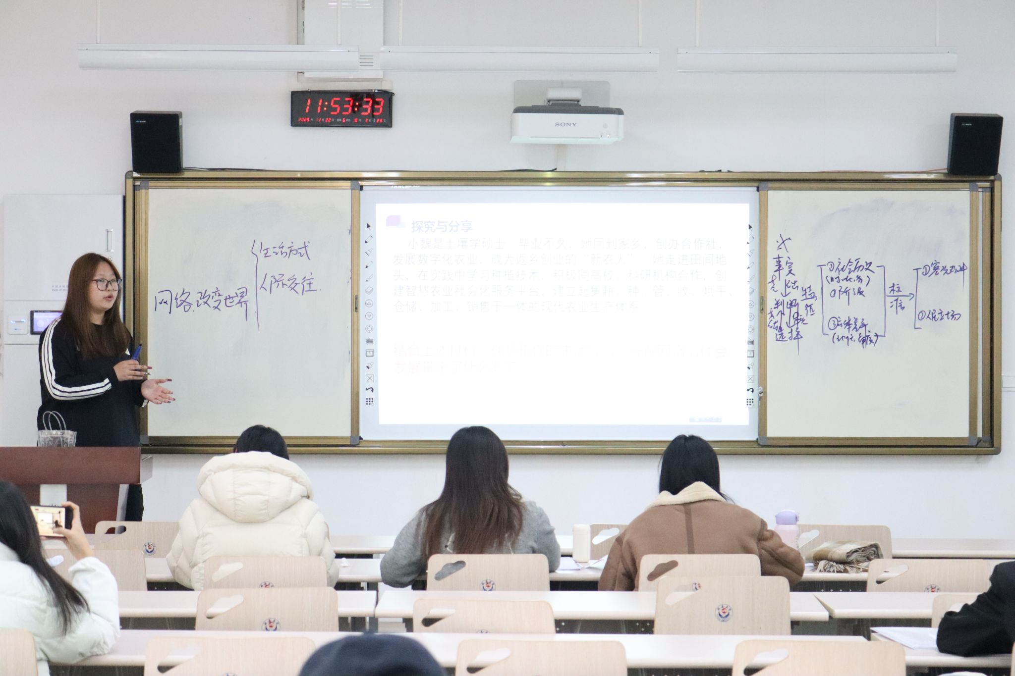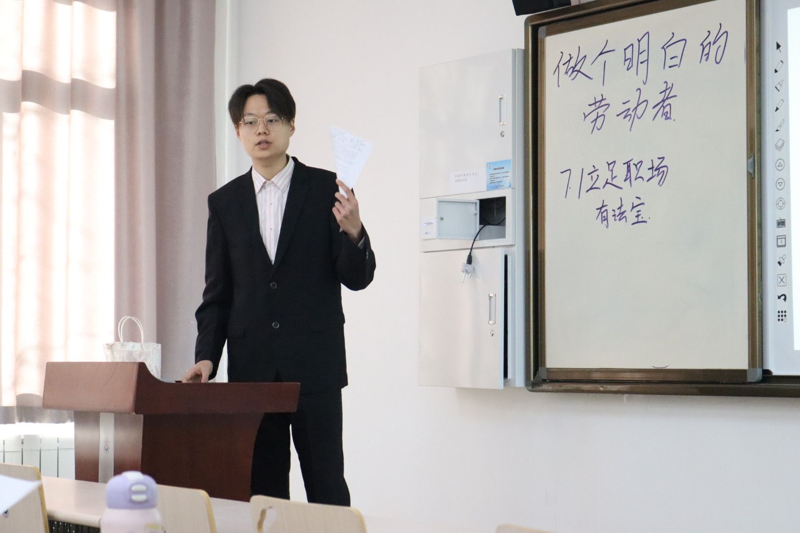 为增强理论与实践的融合,明确师范生的培养定位,有效提升师范生的教学实操能力,我院思政25级分两组分别于11月22日上午和下午在2101教室举行了教学技能实操大比拼活动。马克思主义理论和学科教学(思政)部分硕士研究生全程参与指导。活动由思政25级于欣冉同学主持,全体同学全程参与。