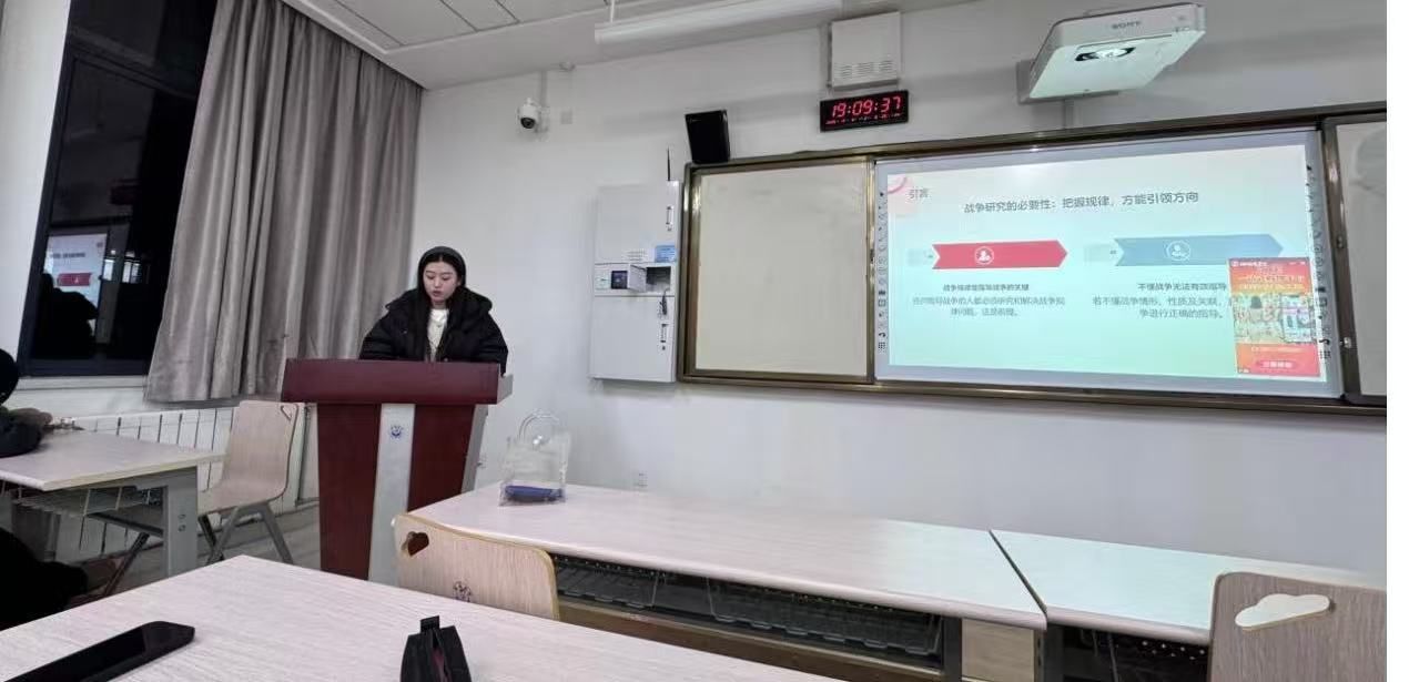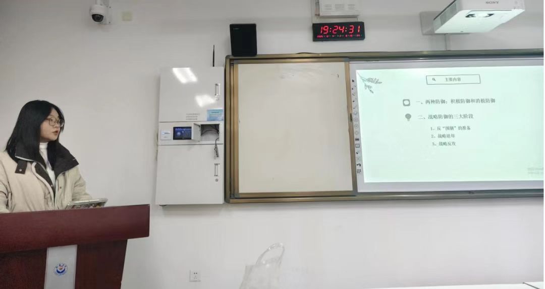 随后,赵妍同学聚焦于战争规律与全局观。强调研究战争规律,分一般、革命、中国革命三个层次的必要性,明确战争目的是消灭战争、实现和平,并区分正义与非正义战争。提出战略全局观,主张全局决定局部,并倡导理论联系实际、知己知彼的学习方法。张奥琪同学侧重于中国革命战争的特殊性与战略。通过分析“围剿”与反“围剿”的历史,强调认识中国革命战争特点(敌强我弱等)的重要性。提出相应战略原则,批判错误思潮,并运用矛盾分析法(具体问题具体分析)挖掘其对新时代青年的思想政治教育意义。刘涵同学深入探讨战略防御思想。结合土地革命和反“围剿”教训,分析“敌强我弱”的现实矛盾,指出这是战略防御成为首要议题的原因。阐述积极防御与消极防御的区别及战略防御的阶段,强调积极防御思想的重要性,并引申出对个人成长(如扬长避短、蓄势待发)的启示。