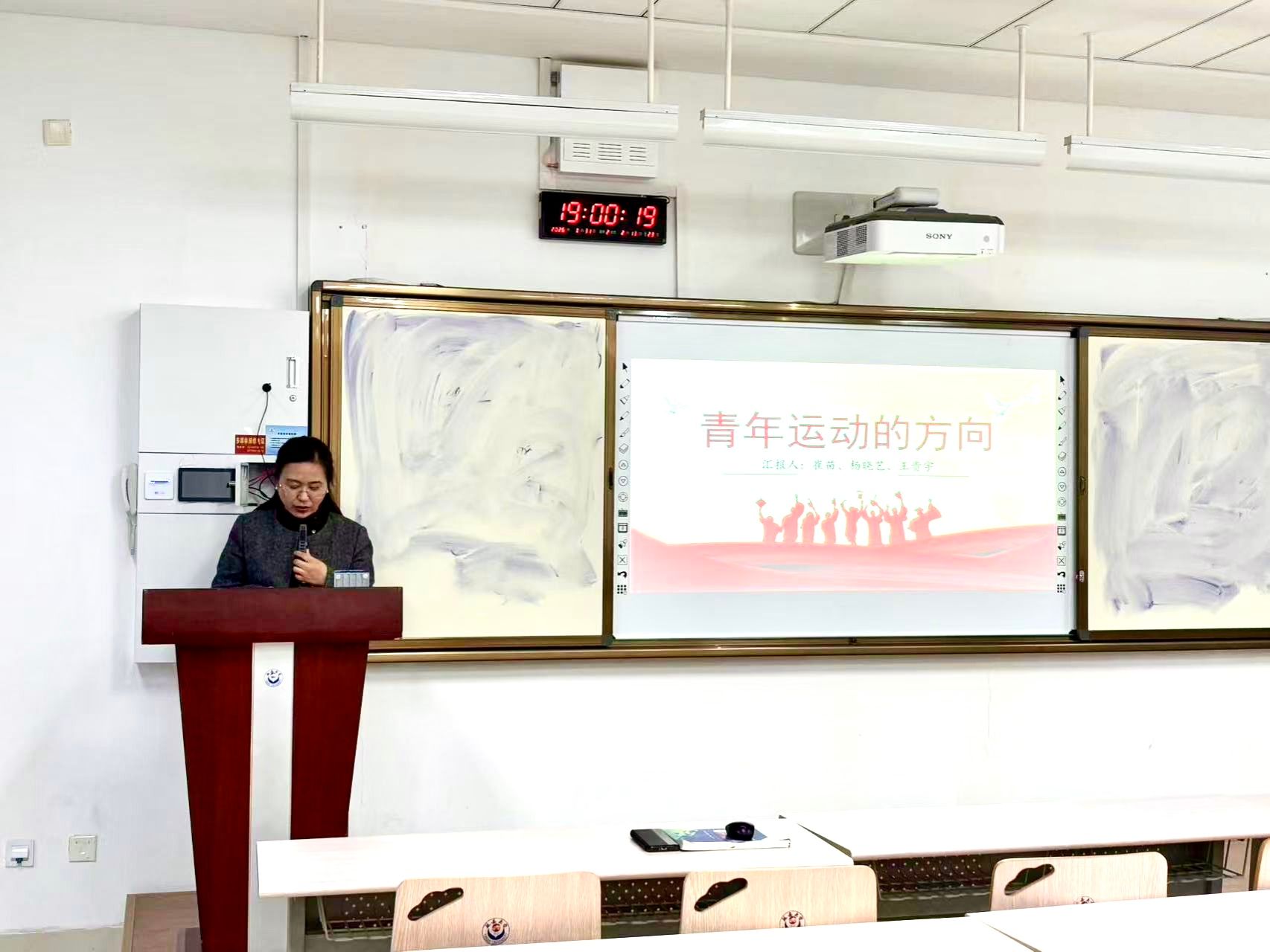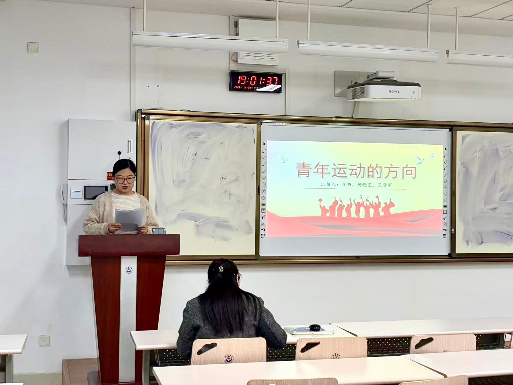 读书会开始,崔苗同学简要介绍了《青年运动的方向》写作背景,以及本次读书会的流程:杨晓艺同学领读1-4段,王贵宇同学领读5-8段,崔苗同学进行总结与讲述爱国青年奔赴延安的故事。