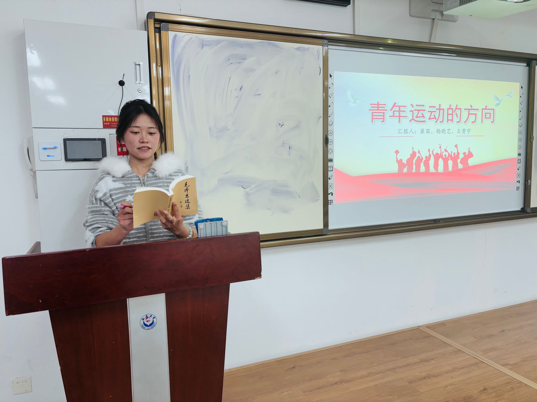 杨晓艺同学围绕《青年运动的方向》第1-4段展开系统解读。首先梳理了全文开篇的背景与主题,明确1939年5月4日五四运动二十周年纪念日、延安青年纪念大会的时空背景,点明“中国青年运动的方向”这一核心议题;接着阐释了设立五四青年节的决策逻辑,从革命由败转胜的转折意义、五四运动反帝反封建的本质属性切入,结合抗战相持阶段的现实形势,解读了节日设立对动员青年投身抗日救亡的时代价值;随后以设问递进的方式,拆解了中国革命的核心要素,明确革命对象、主体、动力与骨干,厘清了中国革命的性质、范围与最终目标,阐释了团结民族资产阶级、依靠工农大众的政策逻辑;最后围绕中国革命的经验教训展开分析,梳理近代革命历程,总结失败根源,强调动员占全国人口90%的工农大众,是完成反帝反封建任务、夺取抗战胜利的根本遵循,为青年践行五四精神、投身革命实践指明了方向。